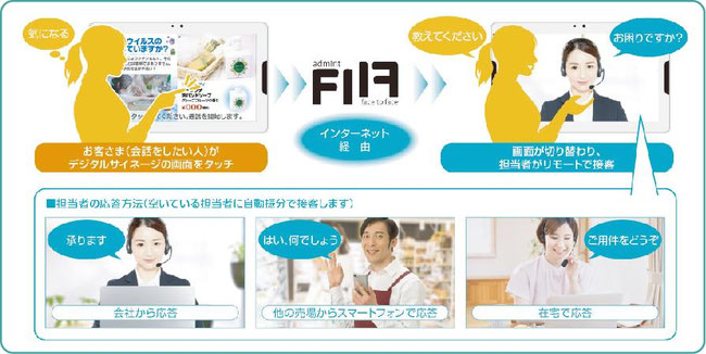 Admint FiiFとは、インターネットを介して、環境を選ばず、思いついたその時すぐに、画面を通じて対話ができるコミュニケーションツール。デジタルサイネージ、パソコン、スマートフォンのいずれからの発信にも対応しており、別々の場所の複数人からのアクセスも対応可能。さまざまなシーンでお客さまとの対話をお手伝いいたします。